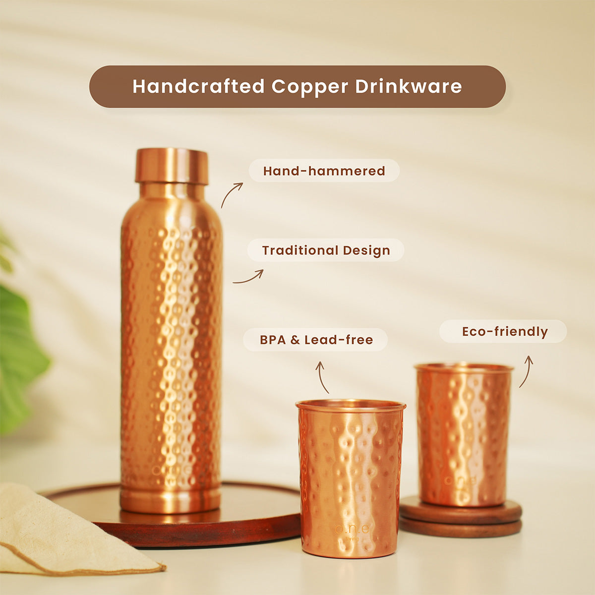 This set of handcrafted copper bottle and 2 glasses is a sustainable and healthy addition to your daily hydration routine.