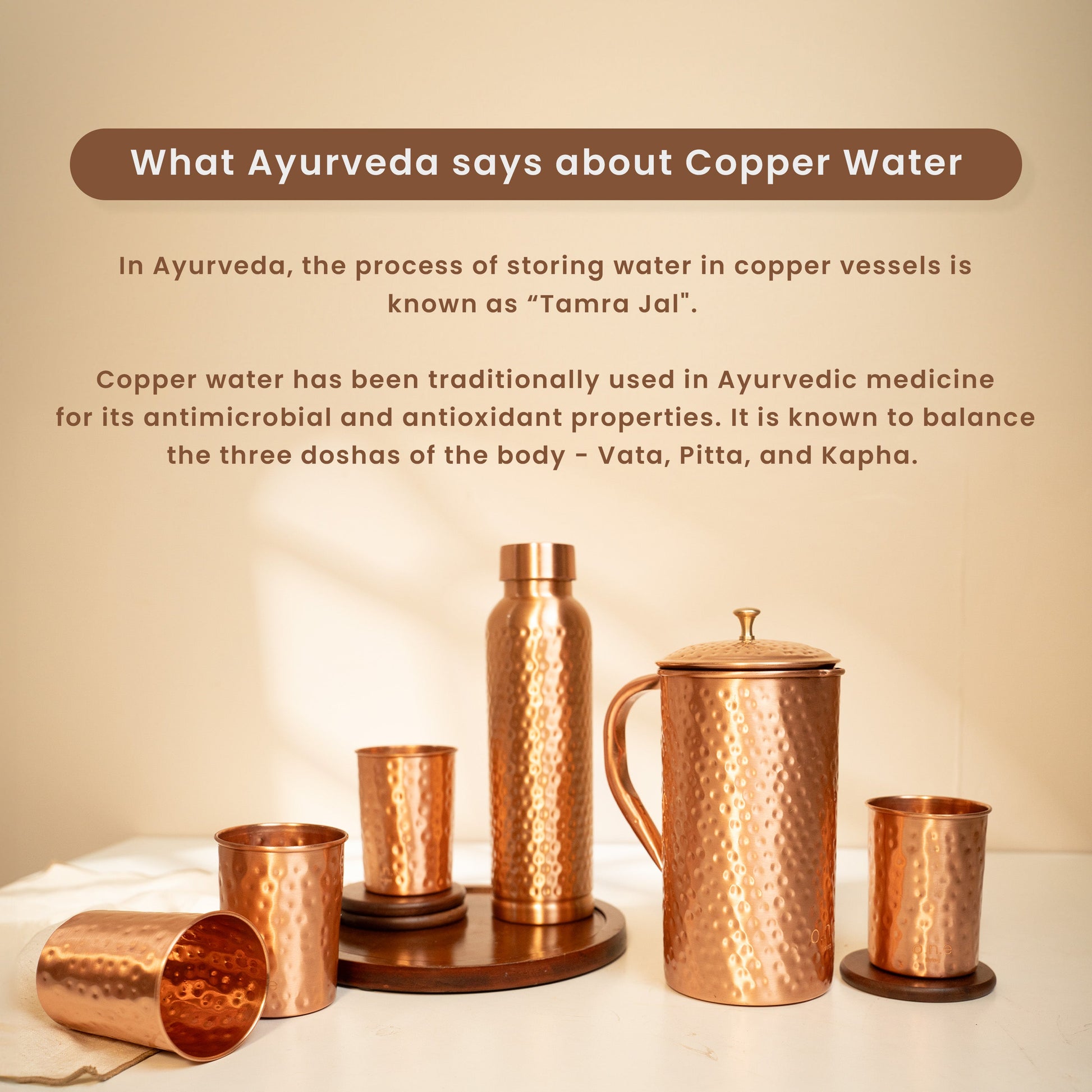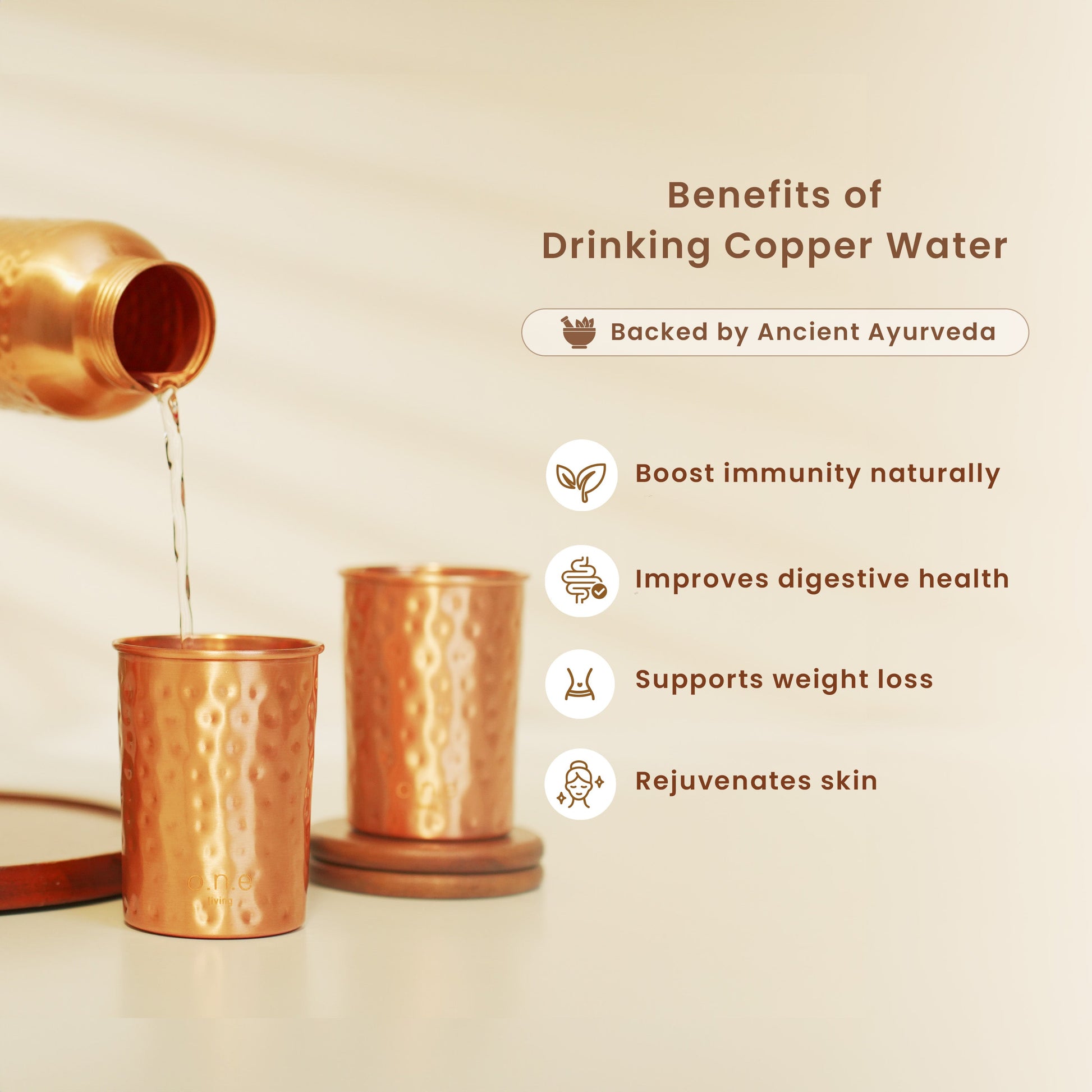 Copper is celebrated in Ayurveda for its ability to balance the Vata, Pitta, and Kapha doshas that help promote overall wellness. Storing water in copper vessels helps improve digestion, boost immunity, enhances skin health, and strengthens bones. Meanwhile, the antimicrobial properties of copper ensure that the water stays fresh and pure.