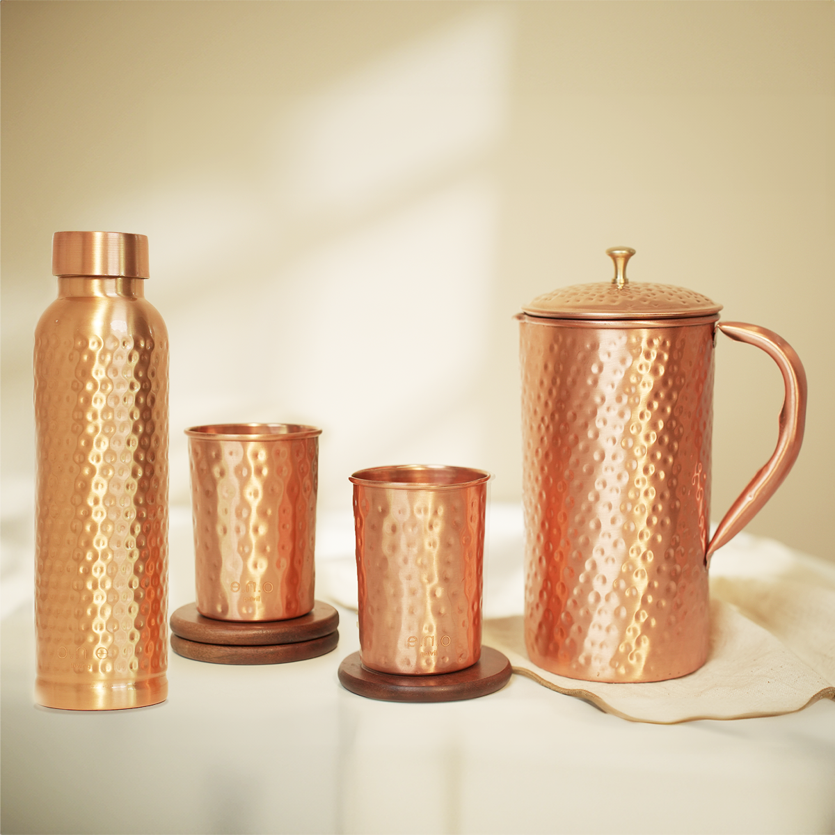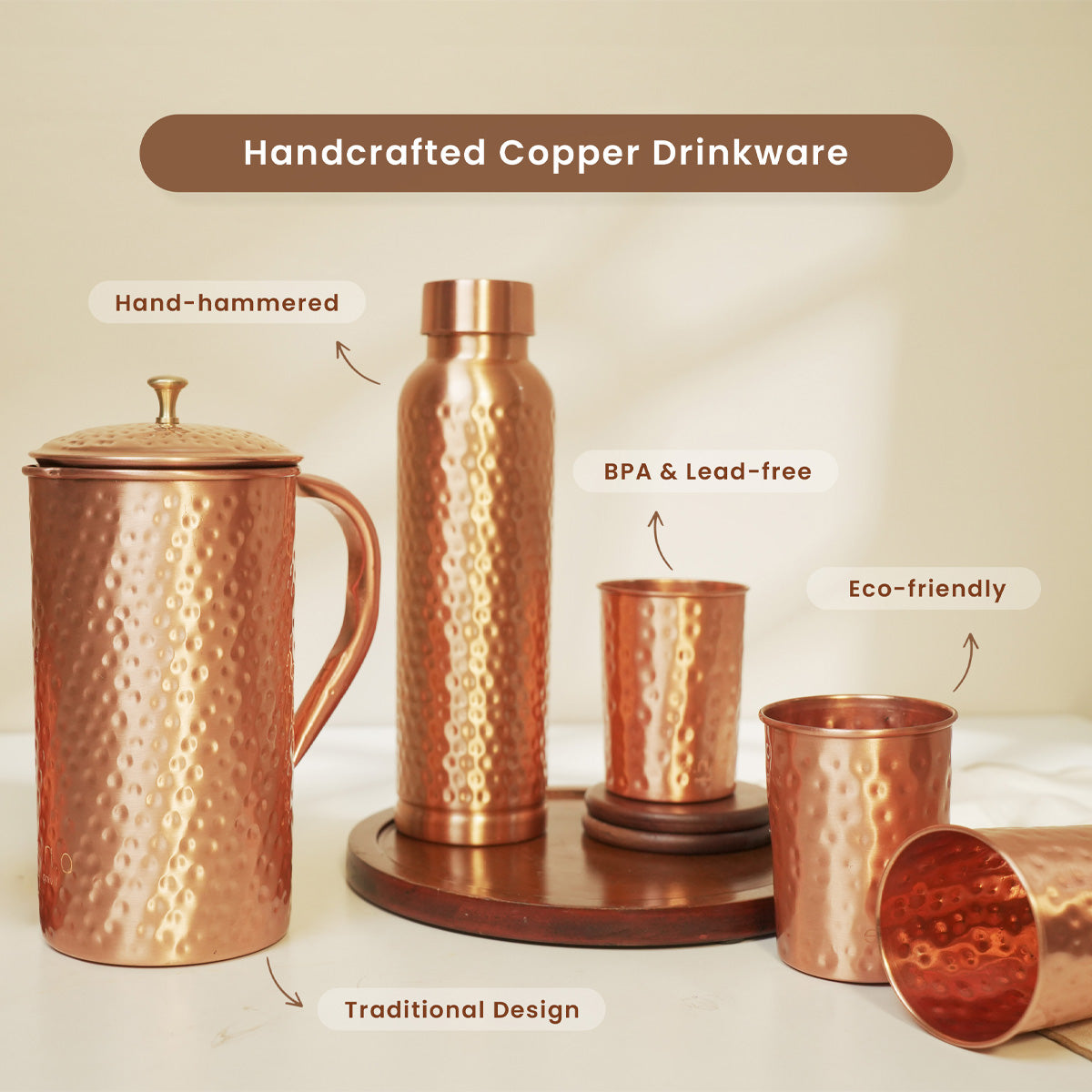 This set of copper drinkware includes a handcrafted copper bottle, a copper jug, and 2 copper glasses. It is a sustainable and healthy addition to your daily hydration routine.