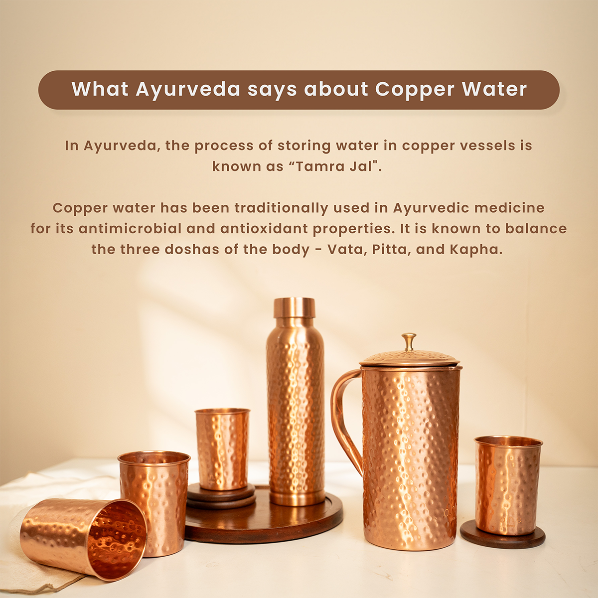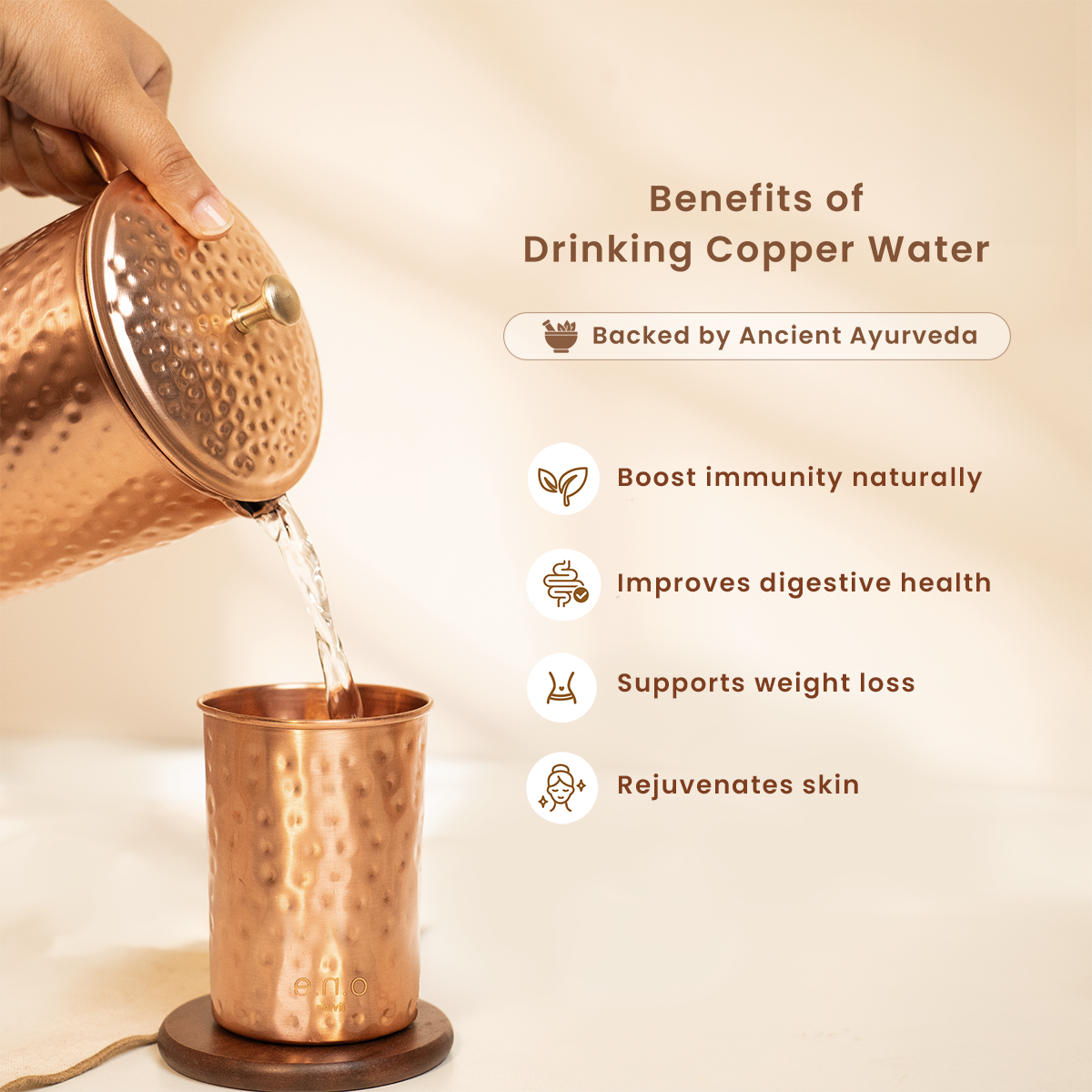 Copper is celebrated in Ayurveda for its ability to balance the Vata, Pitta, and Kapha doshas that help promote overall wellness. Storing water in copper vessels helps improve digestion, boost immunity, enhance skin health, and strengthen bones. Meanwhile, the antimicrobial properties of copper ensure that the water stays fresh and pure.