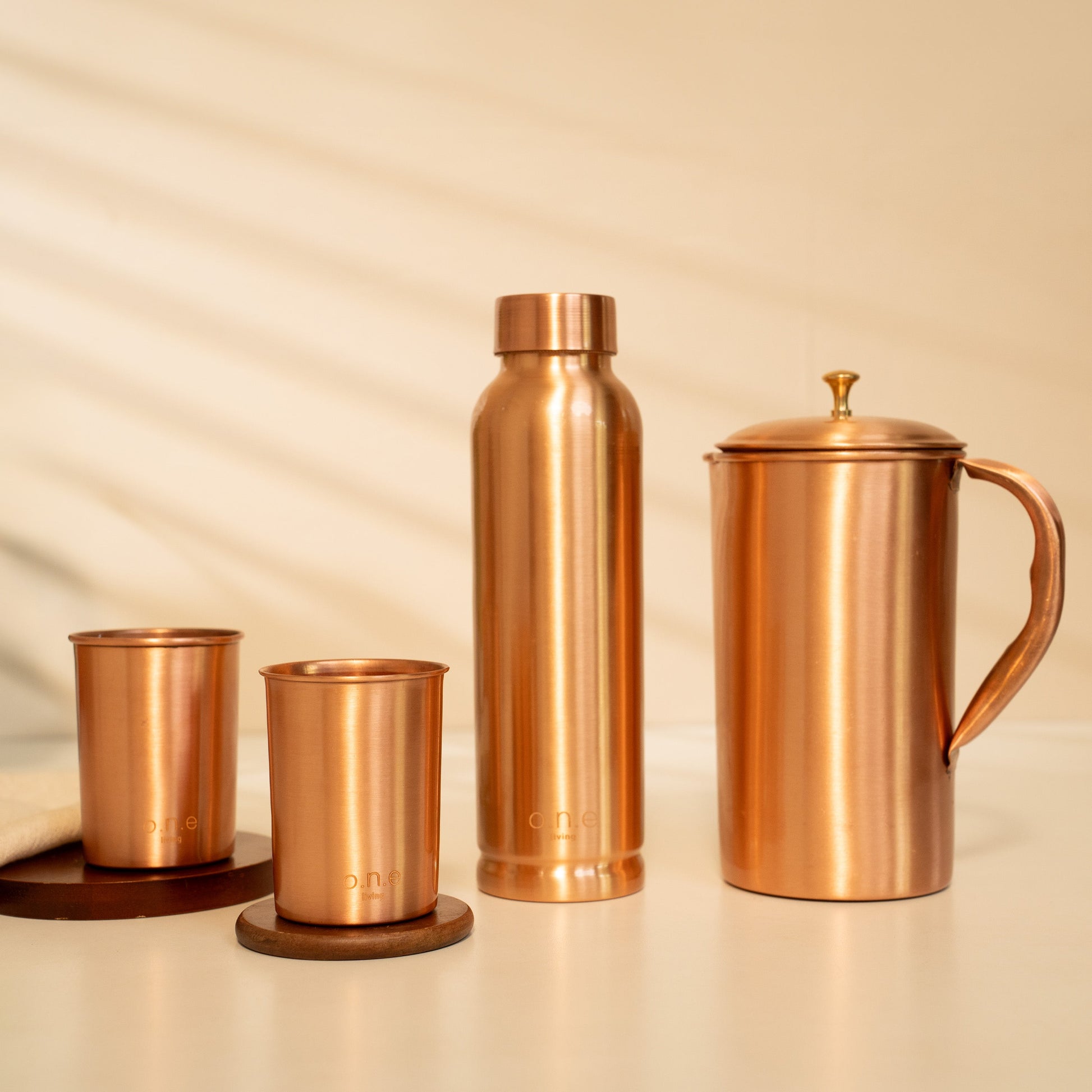 This set of copper drinkware includes a handcrafted copper bottle, a copper jug and 2 copper glasses. It is a sustainable and healthy addition to your daily hydration routine.