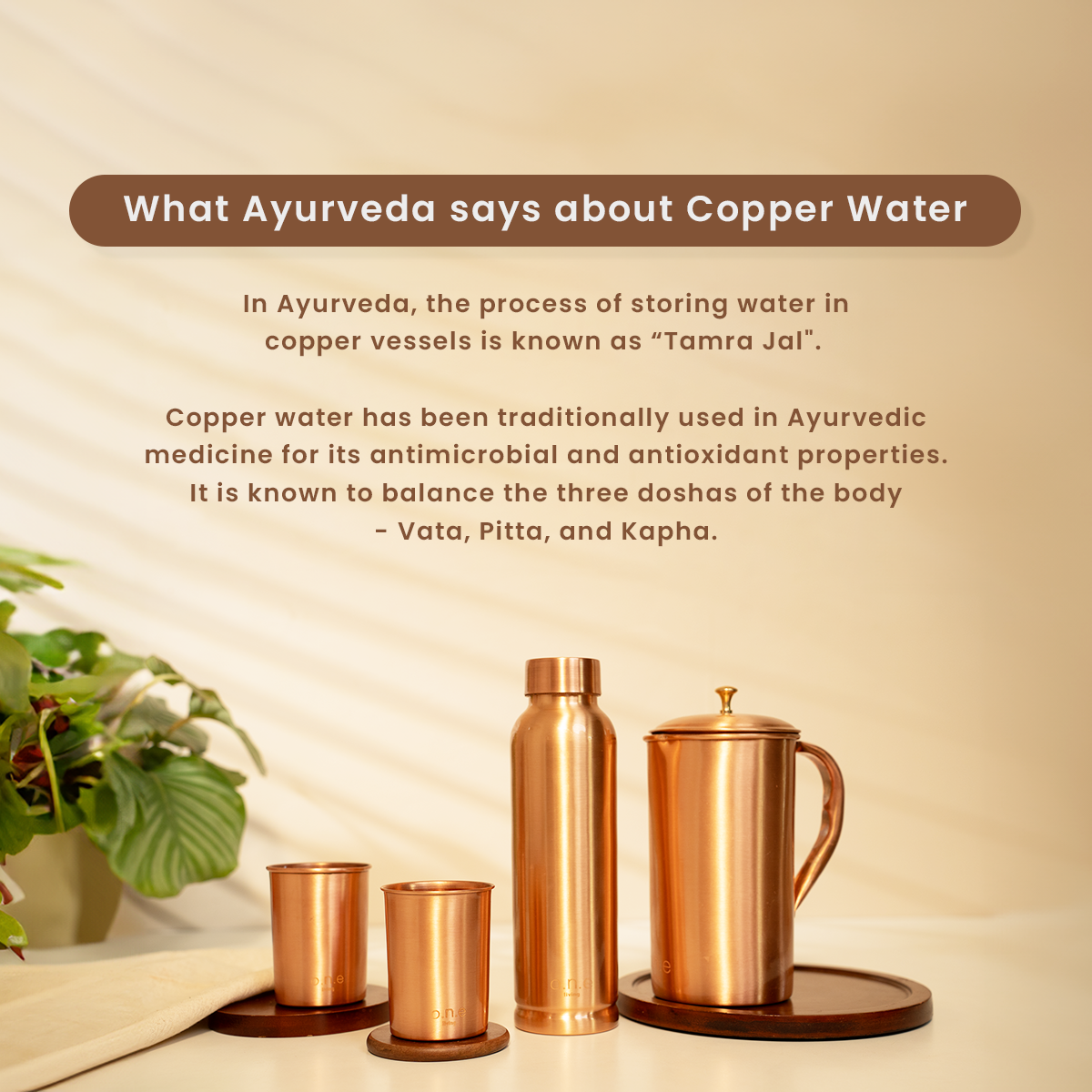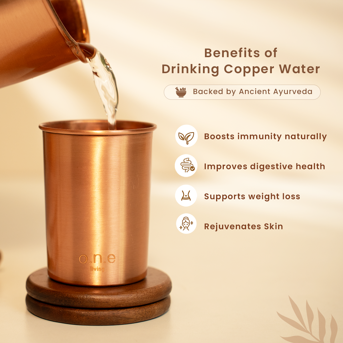 Copper is celebrated in Ayurveda for its ability to balance the Vata, Pitta, and Kapha doshas that help promote overall wellness. Storing water in copper vessels helps improve digestion, boost immunity, enhances skin health, and strengthens bones. Meanwhile, the antimicrobial properties of copper ensure that the water stays fresh and pure.