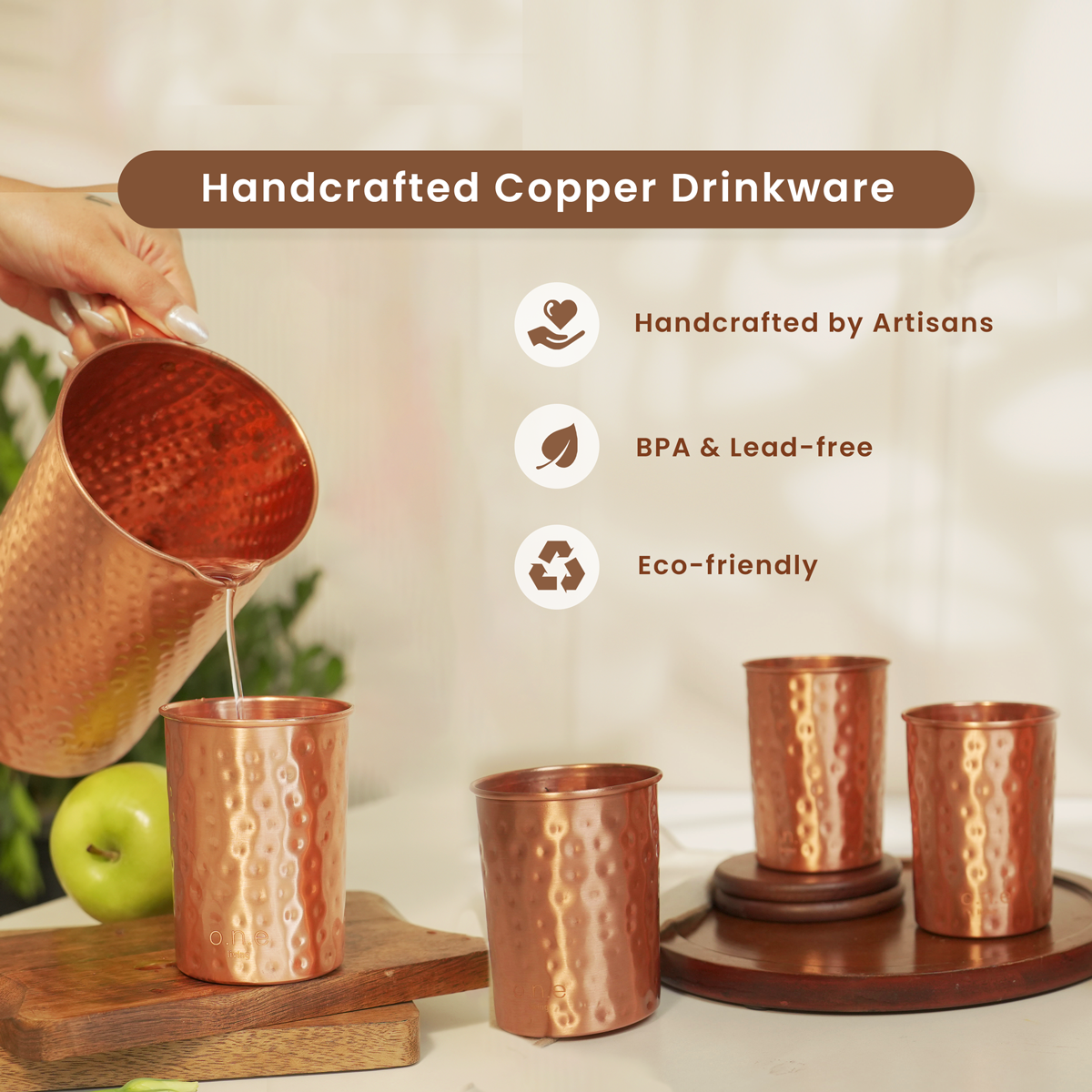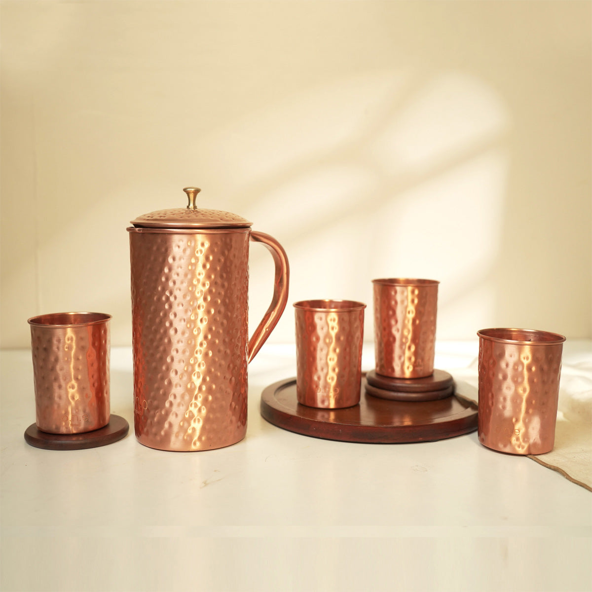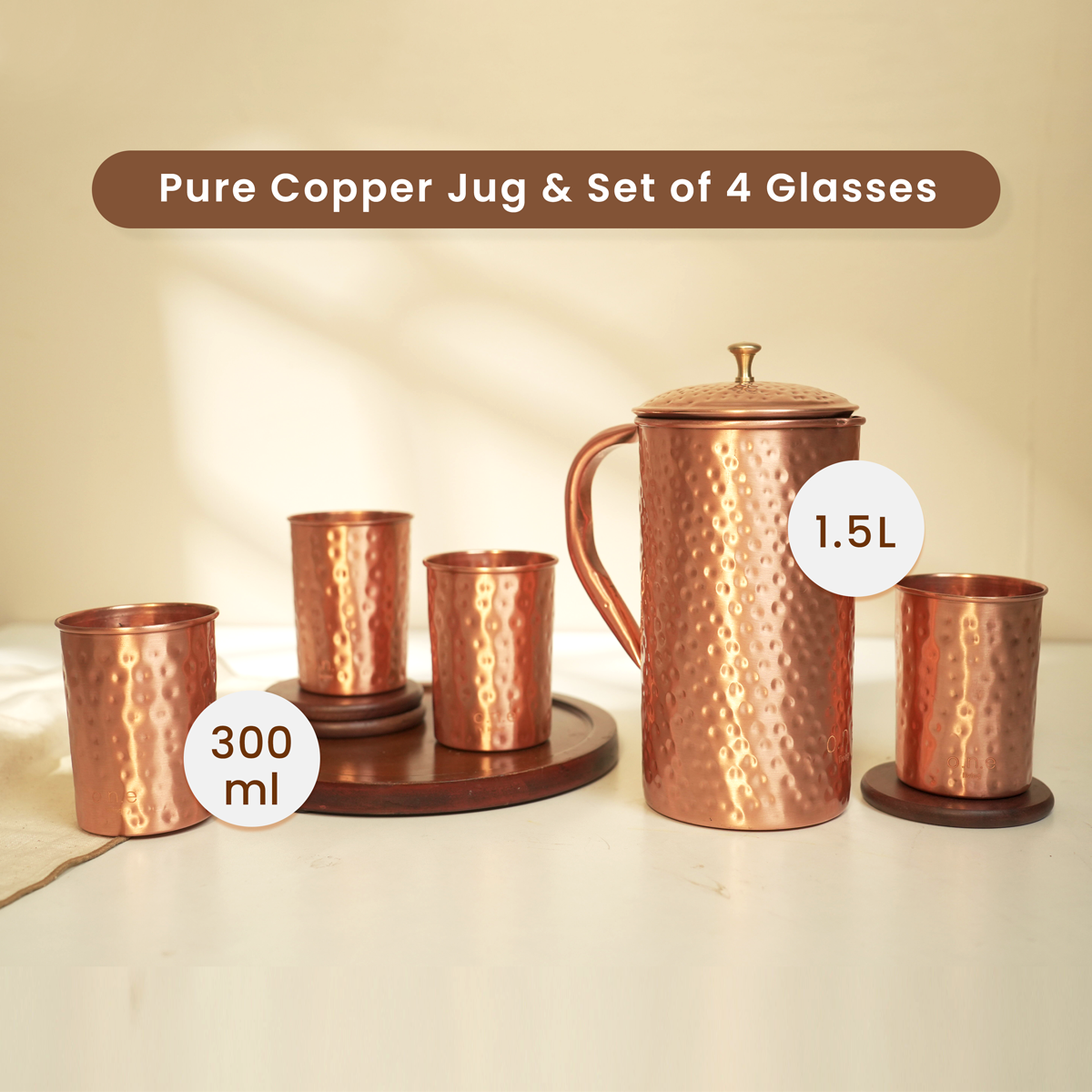 Pure Copper Jug & 4 Glasses Set | Hammered