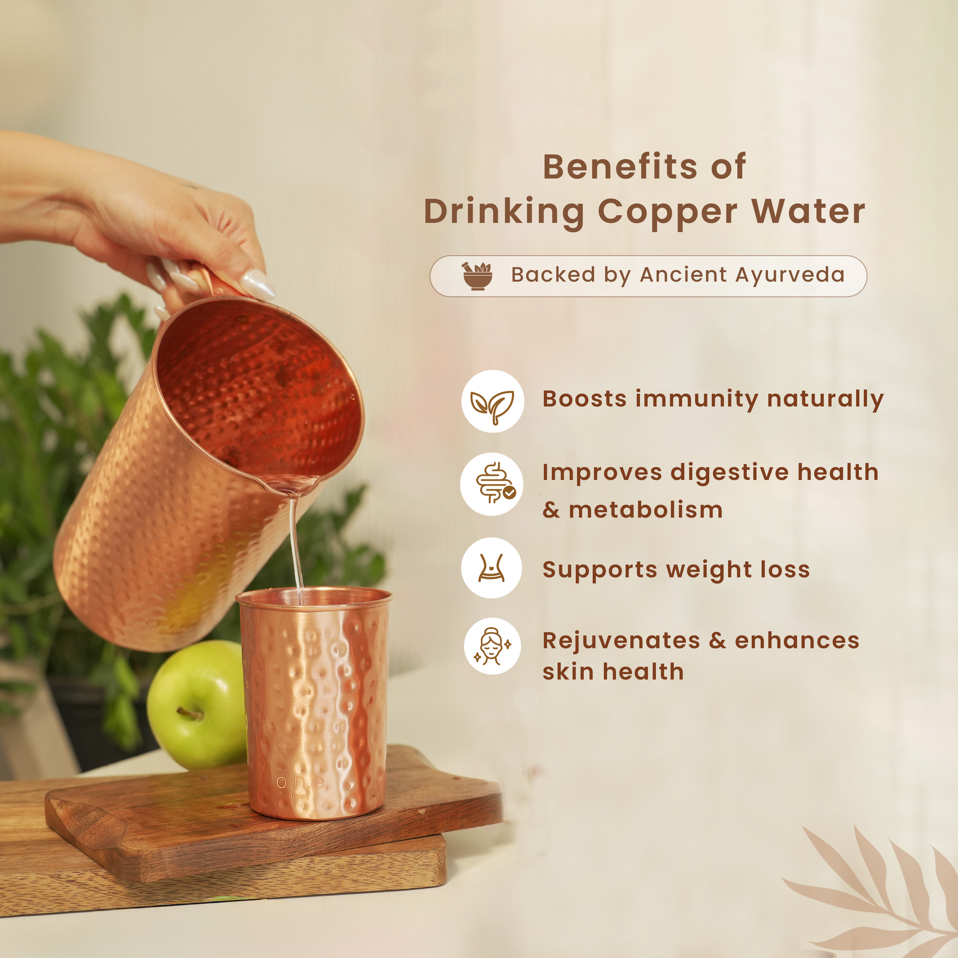 Copper is celebrated in Ayurveda for its ability to balance the Vata, Pitta, and Kapha doshas that help promote overall wellness. Storing water in copper vessels helps improve digestion, boost immunity, enhances skin health, and strengthens bones. Meanwhile, the antimicrobial properties of copper ensure that the water stays fresh and pure.