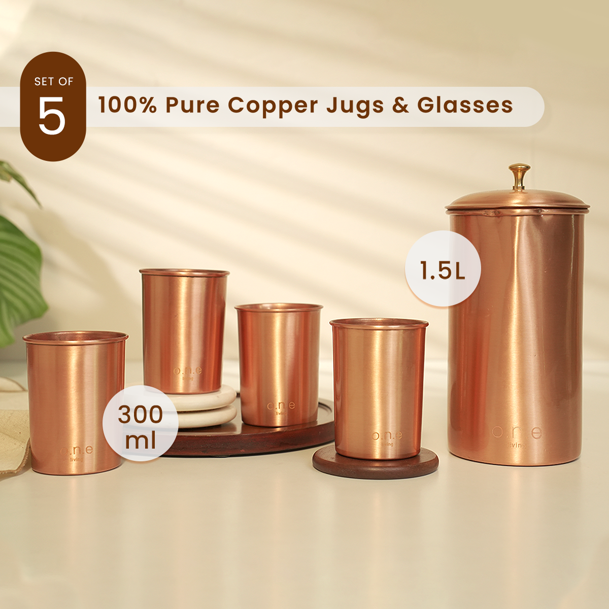 Pure Copper Jug & Set of 4 Glasses | Plain
