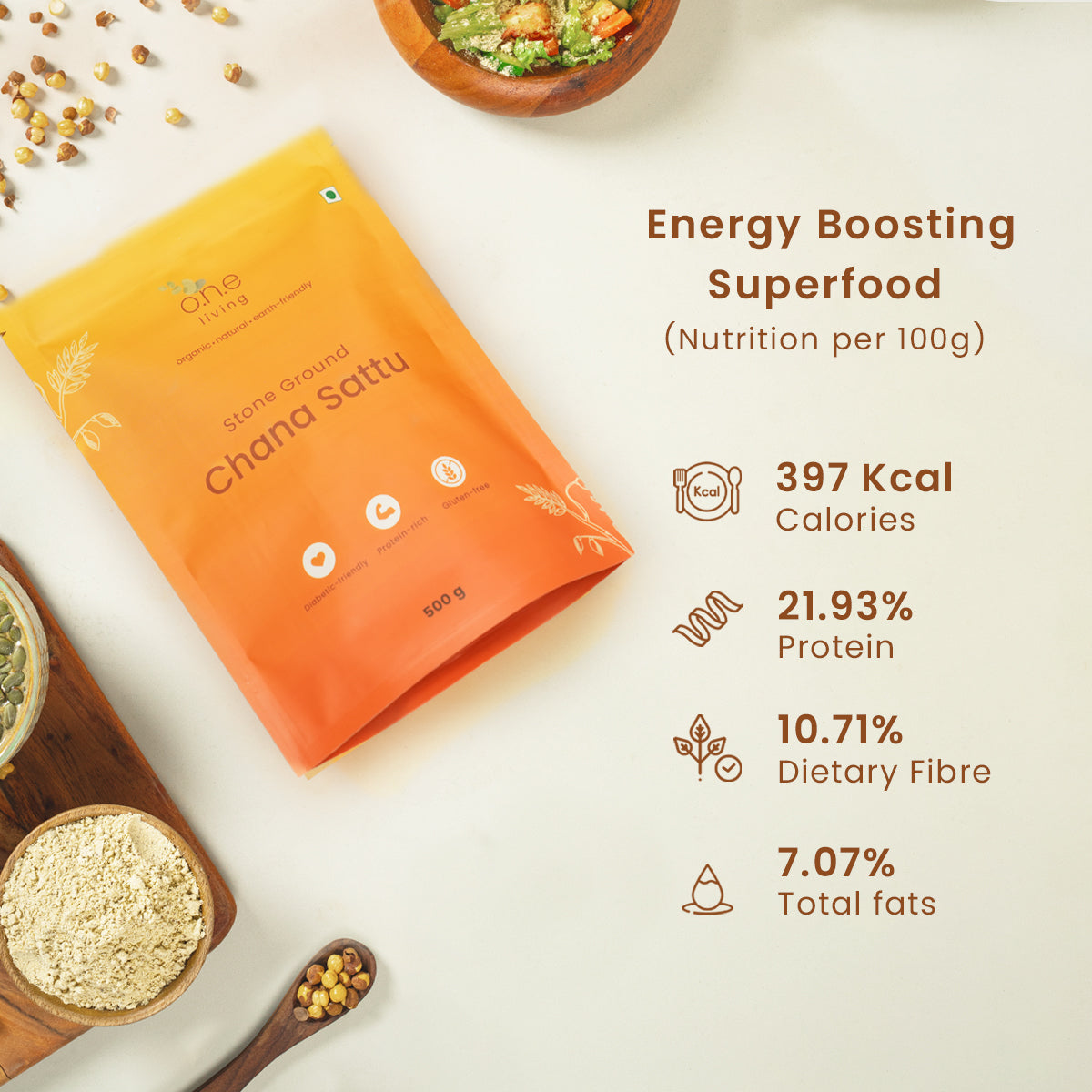 Sattu Powder (1 Kg): O.N.E Living’s Sattu Powder is a protein-rich, gluten-free powder made from roasted gram, perfect for adding a nutty flavour and extra nutrition to your meals.