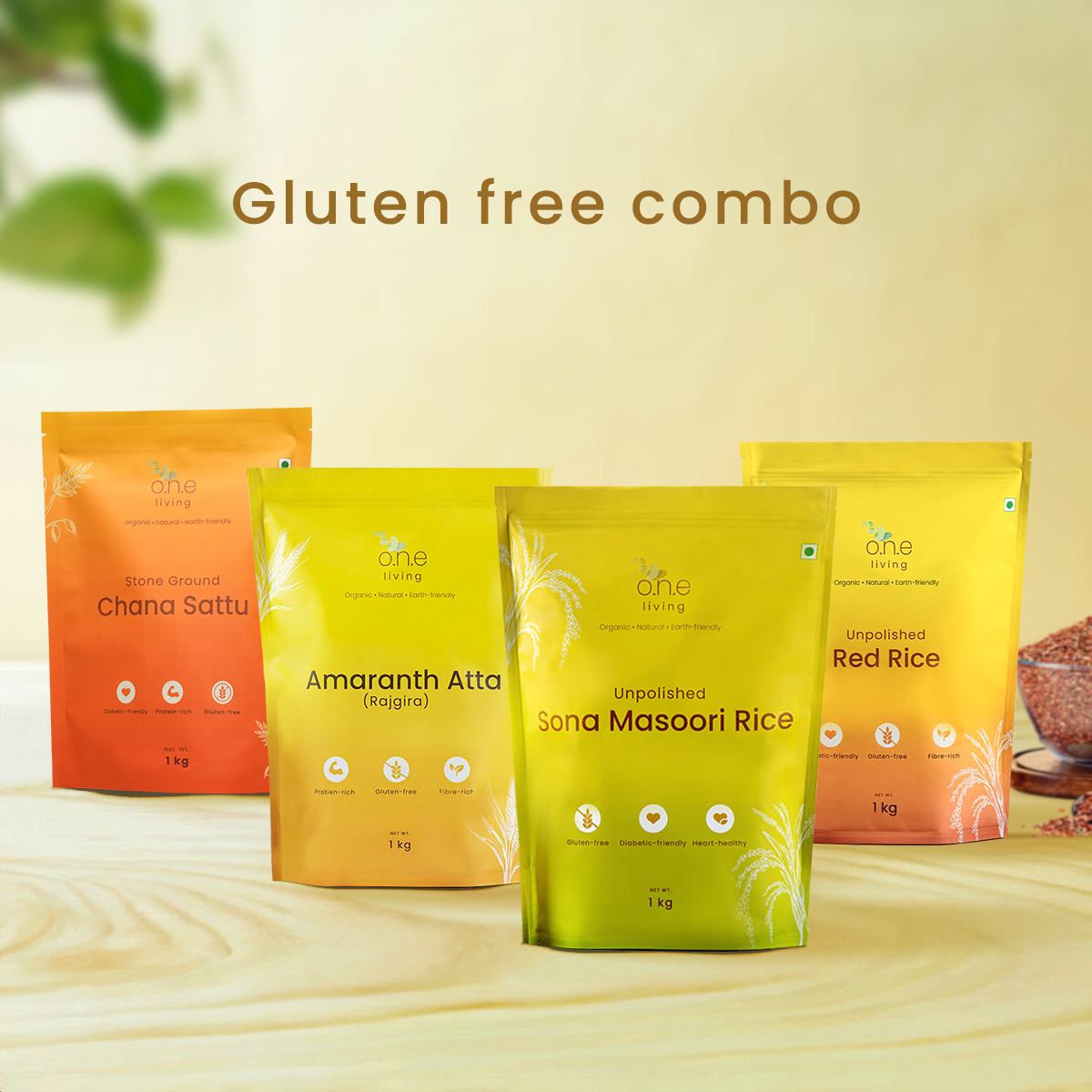 Embrace the freedom to indulge in guilt-free food options with One Living's Gluten-free combo pack. Explore more gluten-free food options like amaranth atta, amaranth flour, rajgira atta, red rice, sona masoori rice, chana sattu, sattu powder, and more at Amala Earth, your one-stop destination for mindful eating and holistic wellness.