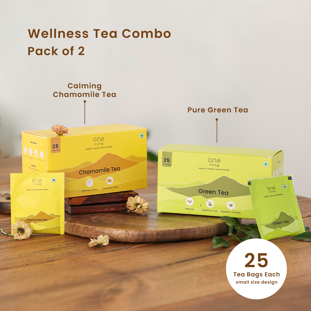 Wellness Tea Combo | Pack of 2 | Chamomile & Green Tea | 25 Tea Bags Each