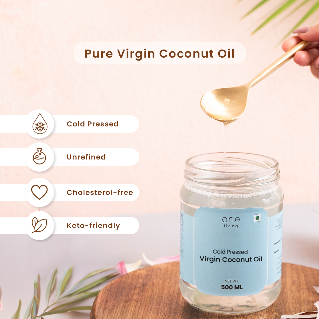 Virgin Coconut Oil (500ml): Cold-pressed Virgin Coconut Oil is cholesterol-free and keto-friendly, supporting healthy cooking and wellness routines.