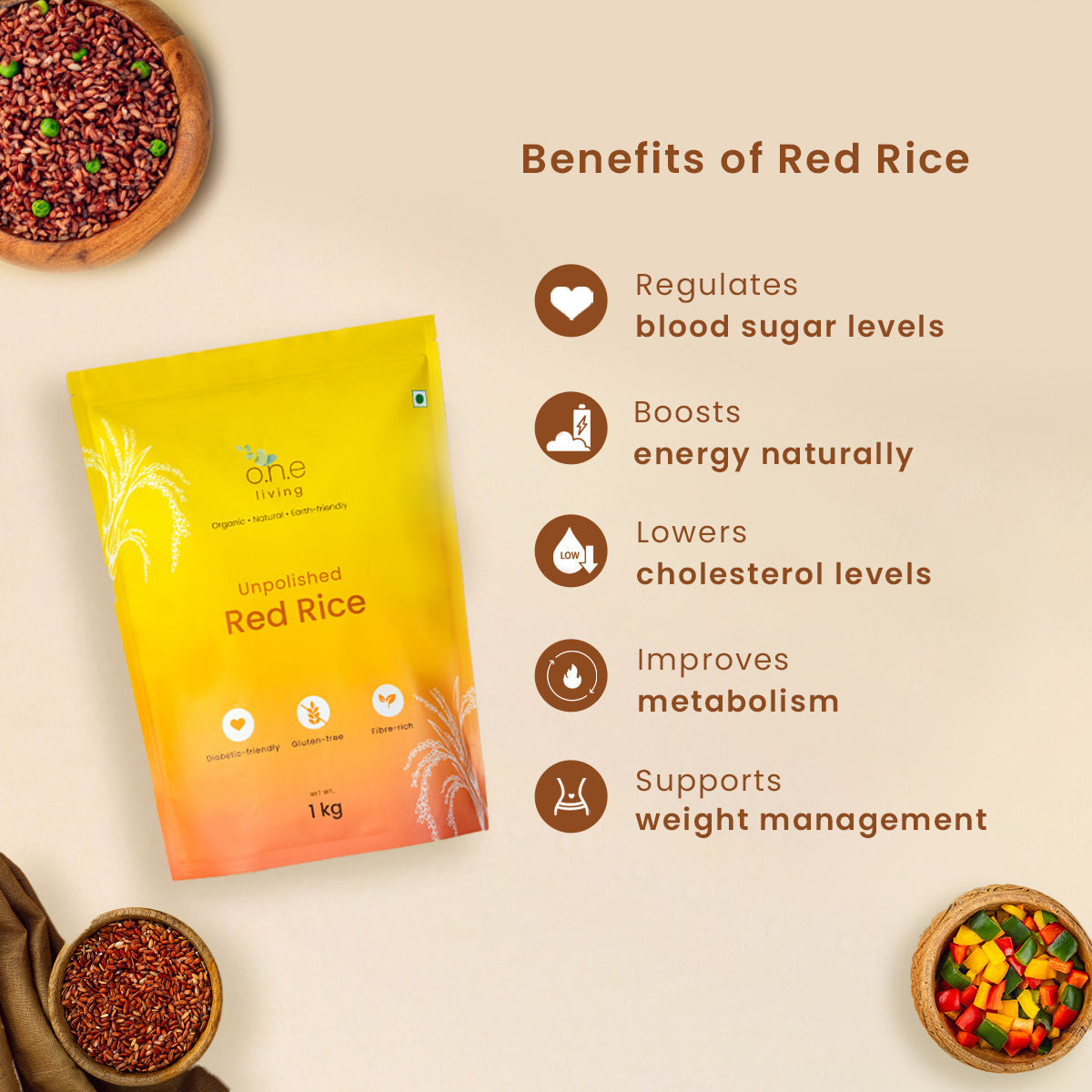 Red Rice (1 Kg): Red Rice is a great source of fibre, vitamins, and antioxidants, supporting blood sugar levels and overall wellness, with a naturally sweet and nutty flavour.