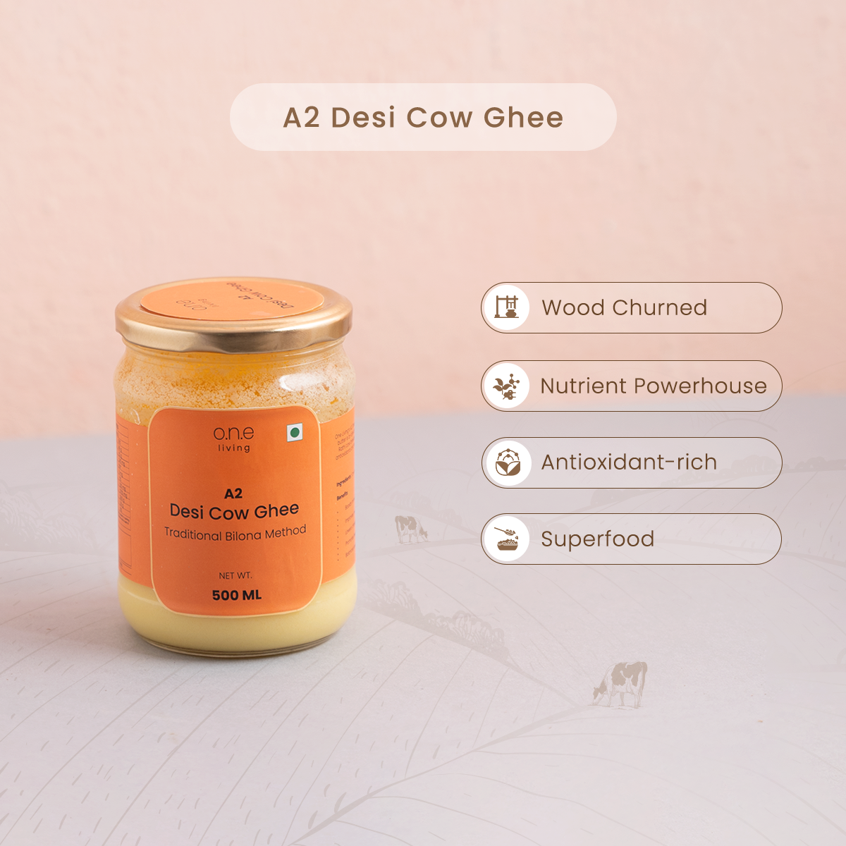 A2 Cow Ghee (500ml): O.N.E Living’s A2 Cow Ghee is made using the traditional Bilona method from Desi Cow milk, packed with antioxidants and essential nutrients, perfect for cooking and wellness.