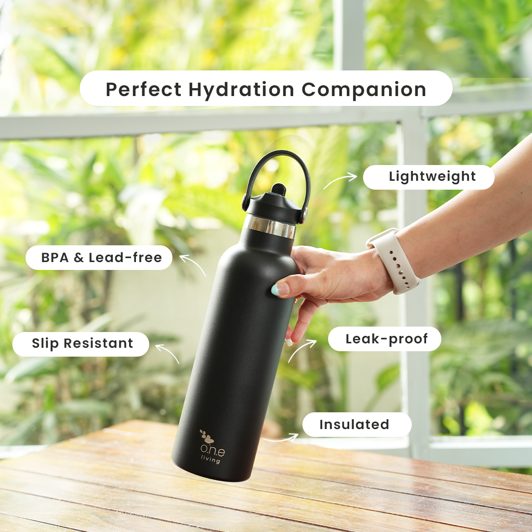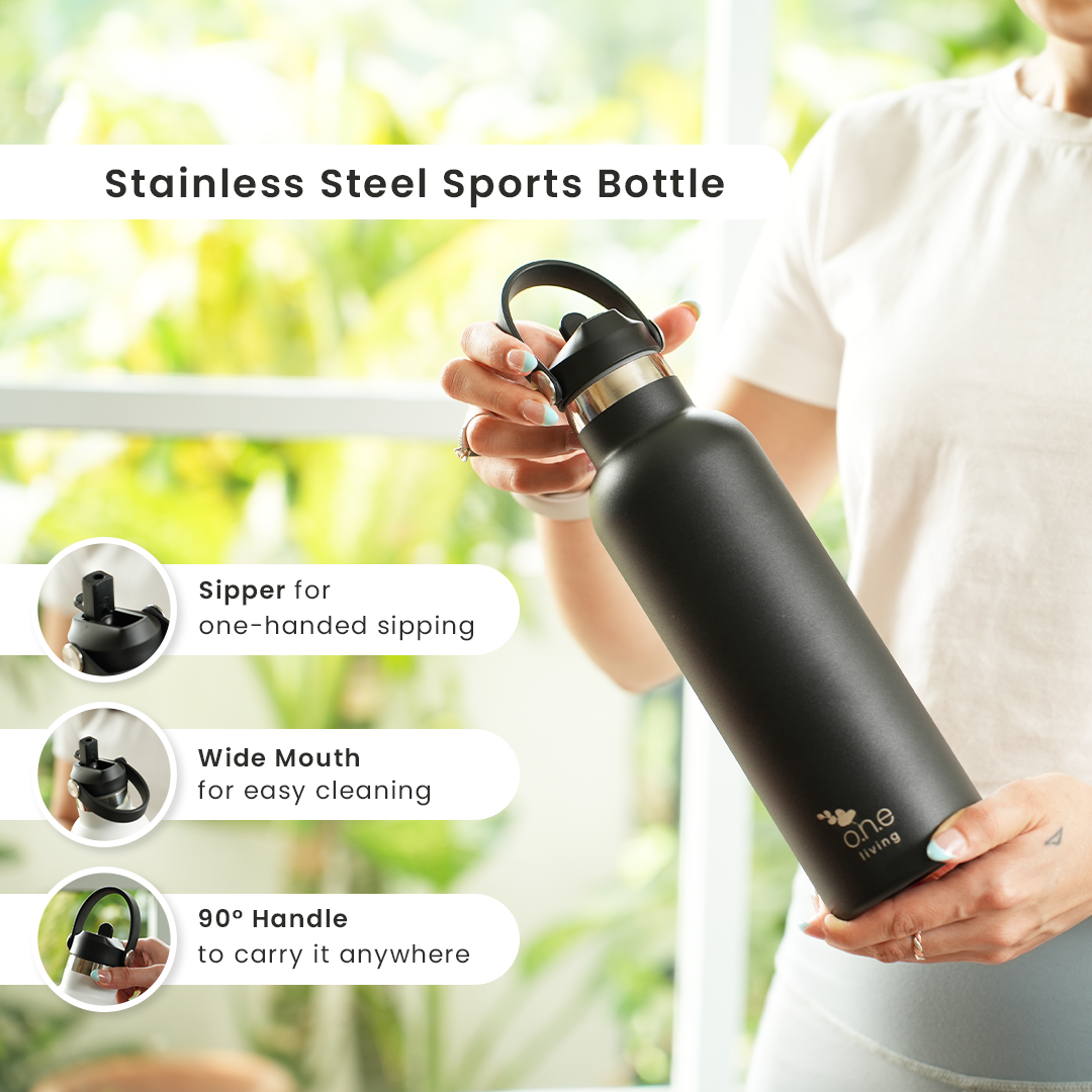Elevate your everyday hydration with One Living’s Stainless Steel Sports Bottle, designed for both practicality and performance. This bottle features a sipper for one-handed sipping, a 90° handle for comfortable carrying, and a wide mouth for easy pouring and cleaning. The double wall insulation keeps beverages hot and cold for over 12 hours, ensuring your drinks stay at the perfect temperature.