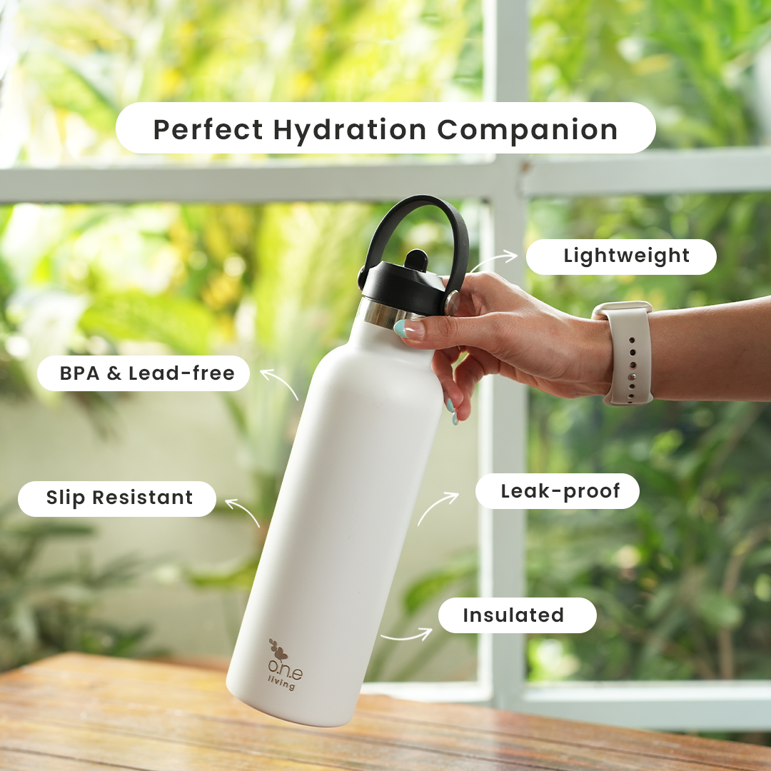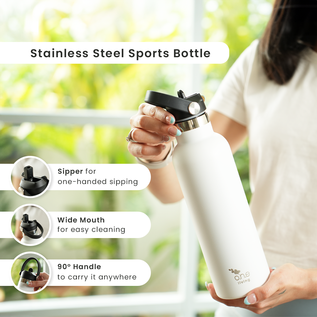 Elevate your everyday hydration with One Living’s Stainless Steel Sports Bottle, designed for both practicality and performance. This bottle features a sipper for one-handed sipping, a 90° handle for comfortable carrying, and a wide mouth for easy pouring and cleaning. The double wall insulation keeps beverages hot and cold for over 12 hours, ensuring your drinks stay at the perfect temperature.